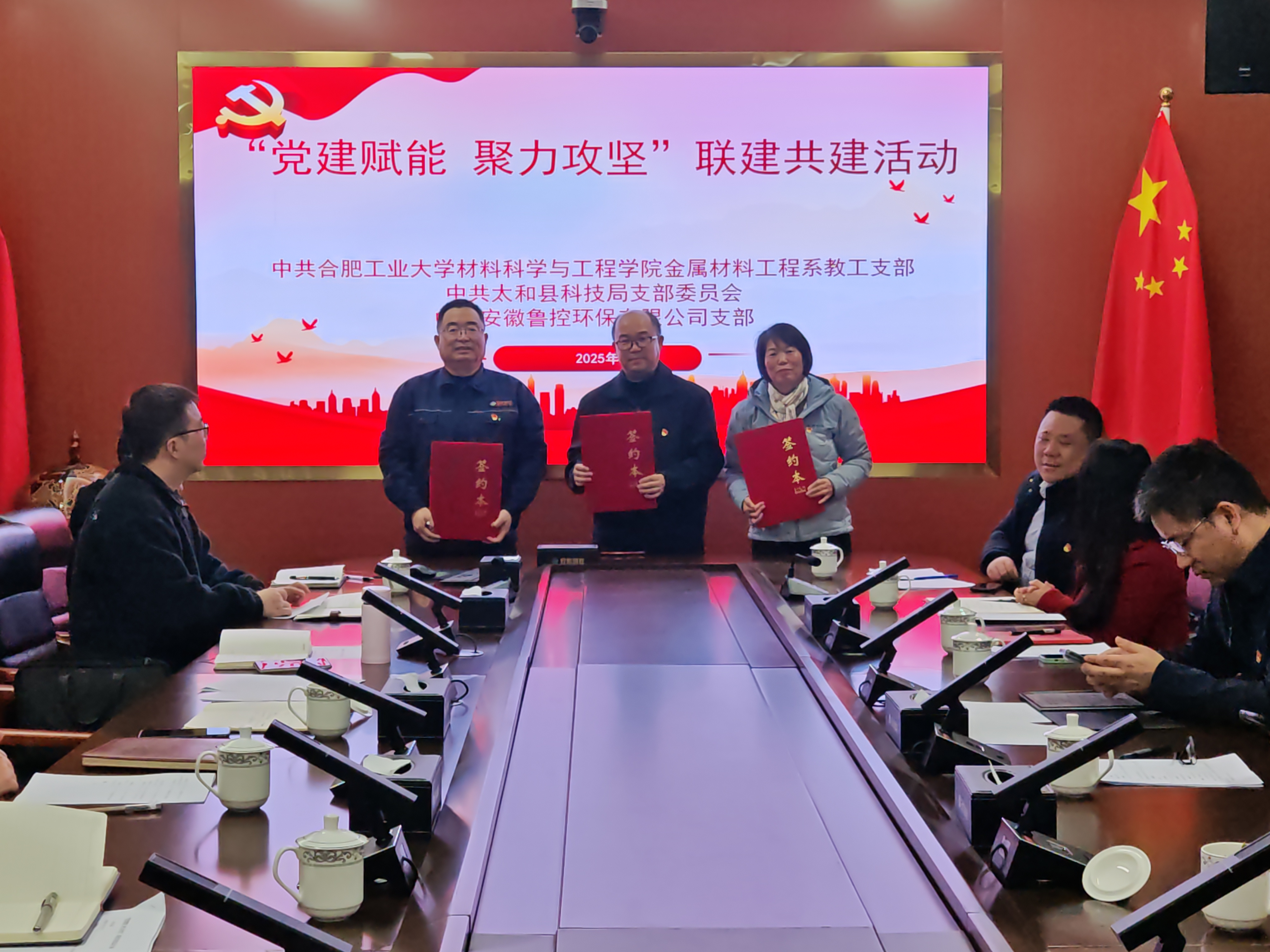 在深化党建引领高质量发展的战略导向下,12月30日,中共安徽鲁控环保有限公司支部、中共合肥工业大学材料科学与工程学院金属材料工程系教工支部、中共太和县科技局支部委员会,创新开展“党建赋能 聚力攻坚”主题联建共建活动。三方以党建为纽带、以业务共建为核心,共同探索政产学研用深度融合新路径,着力构建资源共享、优势互补的战略协同体系。阜阳市科学技术局二级调研员王显林,太和县人民政府党组成员、副县长谢远参加活动。