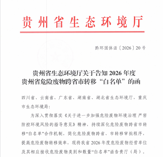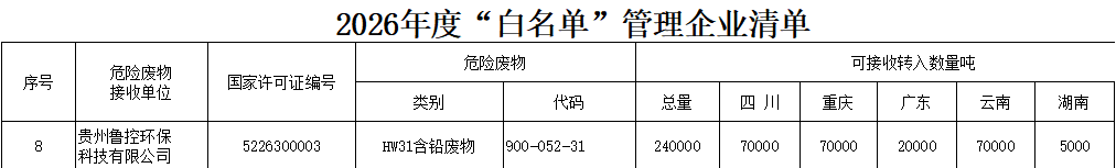 近日,贵州省生态环境厅印发《贵州省生态环境厅关于告知2026年度贵州省危险废物跨省市转移“白名单”的函》,贵州鲁控环保科技有限公司(以下简称“贵州鲁控”)成功入选。根据“白名单”规定,贵州鲁控与四川省、云南省、广东省、湖南省、湖北省、重庆市等六个省市进行含铅废弃物等危险废物跨省转移申请时将获得直接审批,年累计总量为24万吨。